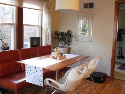 I love how all these little pieces have come together to make a home. The art was an anniversary gift from JT. The vinyl MCM sofa we picked up at an antique mall — that was the first furniture purchase that JT really championed. The tabletop is from my parent’s house but I switched it out to a base from my sister-in-law. The two Karim Rashid Oh chairs were a gift from my mother. The orchid lives with a tiny letter “t” in its pot — part of my ever-growing “t” collection.
