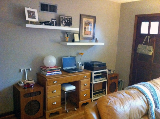 The living room has been in a constant state of flux due to some flat screen TV changes (i.e. we actually joined the new millennium and got a flat screen only to realize it was super tiny and got another, larger flat screen.) As a part of all this craziness, the audio equipment has also been moved around and around.