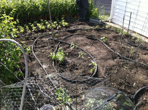 In past years we’ve had the tomatoes at the back, along the alley where the neighbor’s flowers are now. I’m pretty sure some of the good for nothings that wander the alley during the day because they don’t have jobs were eating said tomatoes so we decided to move everything inboard. Not that it will stop all the neighborhood murder birds, squirrels or rabbits, but hey, we had to try.