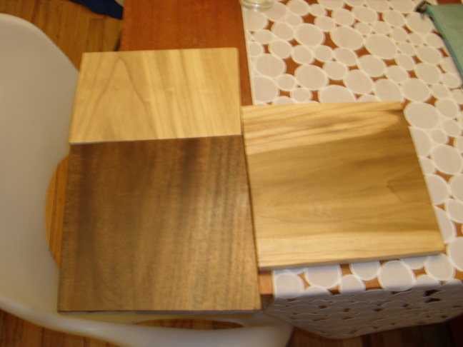 Then JT had some fun doing test pieces of poplar to decide what stain and oils to use on the body. I did an experiment with steel wool and vinegar for a black-ish stain that was less than successful.