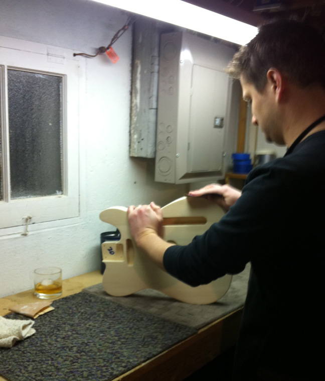 Next came the sanding. Sanding, sanding, sanding. And whiskey, an integral part of the home guitar-building process.