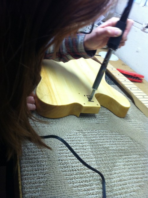 I have a small obsession with the letter T. Since this was JT’s first guitar-build attempt, I named our Baby T001. However I was using the soldering iron and it all needed to fit in the spot where the back plate would go, so it ended up looking like T–1. Whatever.