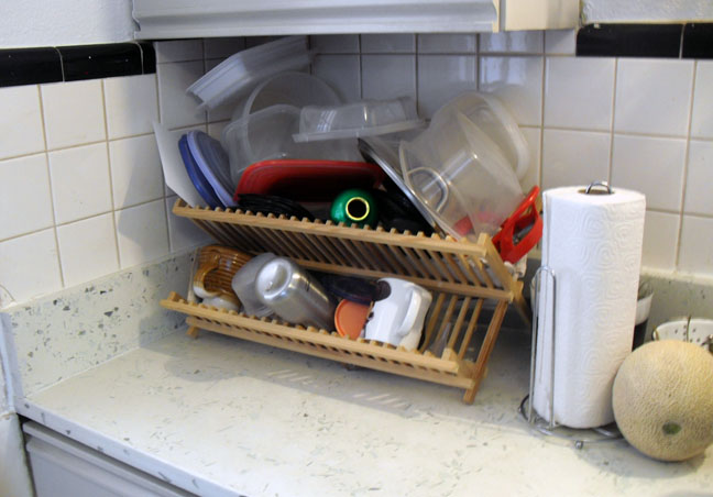 One night as I was emptying the dishwasher, I went to set a reusable plastic container on the drying rack and found . . . .
