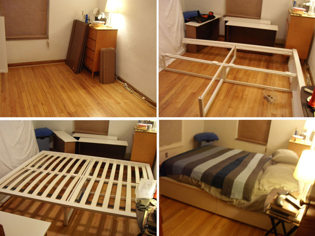 It took a lot of patience, one glass of whiskey and two cups of coffee to get all these parts doweled, screwed and assembled in general. I was so excited about the storage drawers . . . until it came time to put them together . . . Thankfully the slats are banded together with elastic and didn’t need screws or nails on each one or that would have been a long night! Assembly time — I didn’t watch the clock exactly– but we listened to Rolling Stone’s “Emotional Rescue”, then R.E.M. “Monster” followed by The Kinks “Lola versus Powerman” and then wrapped it up with part of Arcade Fire “The Suburbs” and Radiohead “Ok Computer” to wind down. I find that’s usually a way I measure time — as in “that only took three songs” or something like that . . . weird I know.
