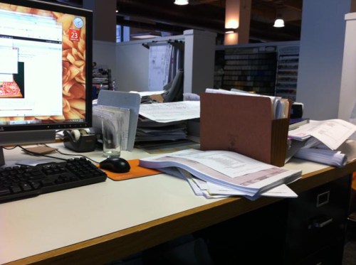 There’s a big meeting with some engineers and construction manager about a project. Oh joy. (Isn’t my desk a horrible mess? I couldn’t bear to photograph it the other way because the credenza behind my desk is even worse. That’s what happens when you have about 10 projects go out in the span of a few months.)