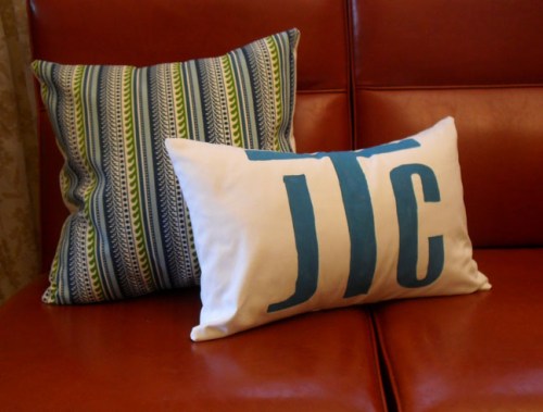 Then I just got to work with my trusty Kenmore sewing machine. And then I ran out of thread . . . And then it took me two weeks before I could buy more thread . . . And then I photographed these pillows three different times and didn’t like how any of the pictures turned out . . . . So needless to say this one has been in the hopper for a while. If I were to do it over again, I would shrink down the height of the monogram a little to accommodate for the curve as it wraps around the pillow. Live and learn.