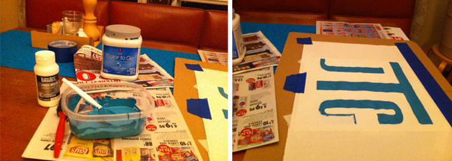 I taped my template down to a piece of cardboard and centered my pillow front over it. Since I had printed my template in black and the fabric was light-colored, I was able to see through it to trace/paint the outline. If you were using a darker fabric, I have used a large piece of acrylic or plexi with a bare lamp bulb underneath as an improvised light table before.