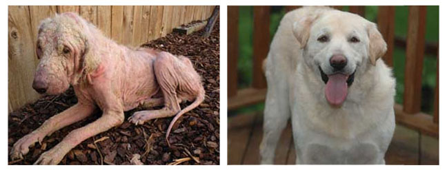 This is Daddy Lab (before and after), a rescue from a few years ago. It’s amazing the number of animals Stray Rescue brings in that are so emaciated and ill like this — and they all turn out to be happy, healthy dogs who make great pets. Stray Rescue has received a $100,000 matching donation from an anonymous “fairy godmother” for the Stracks Fund.