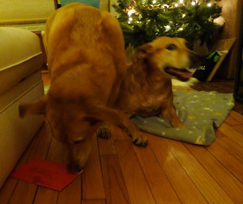 Sophie and Shenanigan actually received their very own Christmas card yesterday and thanks to a little peanut butter, Shenanigan opened it himself while Sophie looked on and hyperventilated. I guess this is the point where most people tell us we should just go ahead and have kids. Yikes.