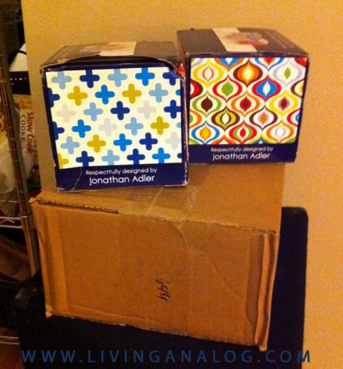 Things “respectfully” designed by Jonathan Adler. I must be a media-marketing sucker. I bought into the Target/Missoni craze. Now I’m buying toilet paper covers? And they didn’t even come with rolls of toilet paper in them, FYI.