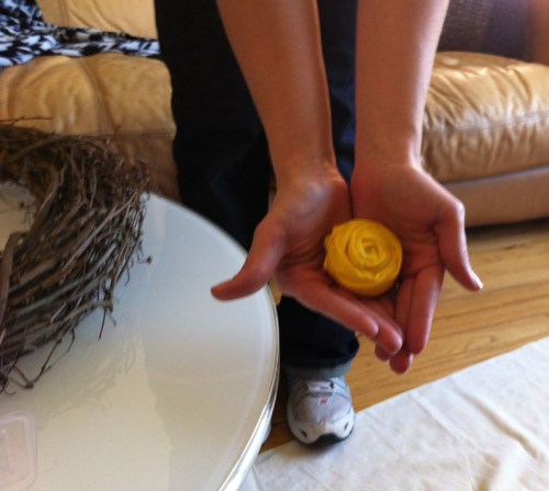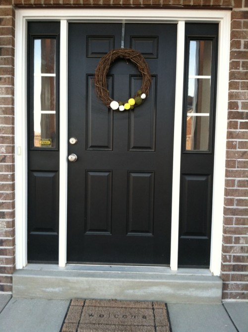 Miss E had found some great inspiration images on Pinterest and wanted to do something spring-y for her front door. Several yards of felt and some hot glue later, her wreath came out so great.