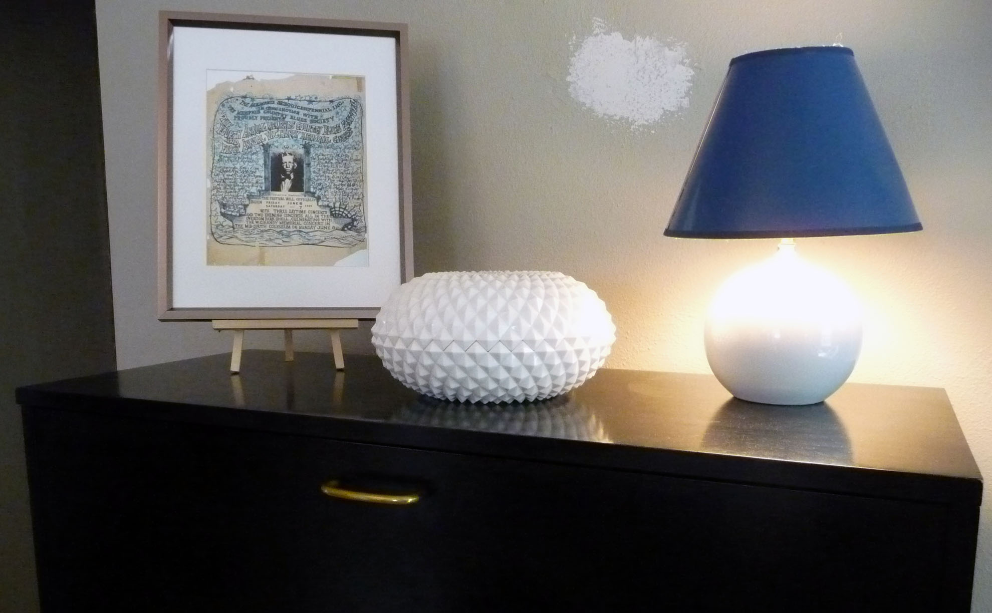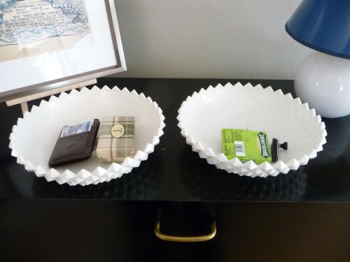 I picked the spiky spaceship up gingerly at Green Shag, expecting it to be heavy but it was surprisingly light – hollow. It is a plastic catch-all dish and for $8 it was most definitely mine. I’m always looking for aesthetically pleasing ways to store stuff. Unlike some of the utterly bare second homes of rich Manhattanites with housekeepers you see on the pages of Elle Decor, we have clutter at our little bungalow and need ways to contain it. Our house is lived in, every inch, and having a great stash spot for things like gum and the bar of “T” soap your mother gave you for Easter even though you are a 31-year-old grown woman is critical (But Thanks Mom!).