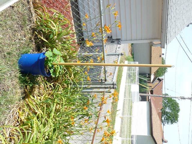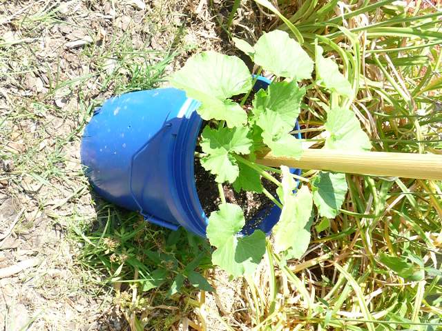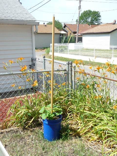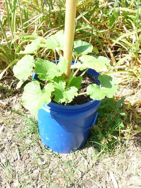 Since the raised bed area has been our garden in previous years but is being converted to the zen spot, we didn’t want to lose all our food growing capabilities. The canopy post buckets became the garden instead. Before I filled the magical little blue buckets with dirt and plants, I drilled four holes around the bucket right above the concrete line so water can drain out. (And yes, I’m actually getting pretty proficient with the drill. That is one power tool even a lefty can use!)