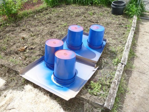 The table is haphazardly placed and may not stay there ($10 Craigslist score, I’m thinking it will also meet the spray paint fate that gets everything else here), but there’s some (admittedly slow) progress there. Let’s rewind. I started out with 4 of the orange work buckets from Home Depot. I think they were about 3 bucks a pop. Next I attacked them with my trusty blue spray paint. (Yes I may have a (blue) spray paint addiction.)