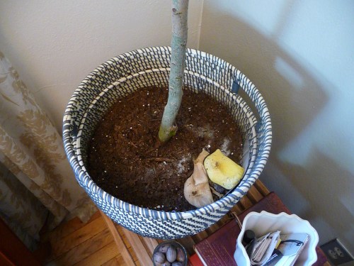Case in point — Little Walter, the tree. He’s perched up on a Nelson-replica slat bench. We don’t often get too close in to him because he’s kind of nestled into the banquette and you’d have to kind of slide down along the seat to get all the way there. However the other day I had the dining table pulled out to do some serious dog hair sweeping and took it upon myself to water Walter as well. Turns out Walter is a Fun Guy! (Fungi was literally having a field day in there. INSIDE my house.)