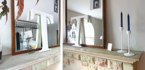 You can kind of see the mantel a little in the picture above and you might be able to see that it was getting a little cluttery. Since I’m having the girls over this weekend for Round #2 of the Stitch ‘n Bitch brunch, I thought I might do a little mantel triage as well. It really involved removing about half the stuff. I also picked up some nice blue candles at Hobby Lobby for my new candle holders I got at the Green Shag Market parking lot sale.