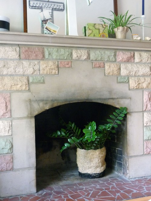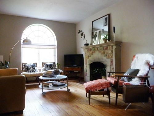Yes I put my ZZ plant in the fireplace. That fireplace is really starting to bother me. (And also the Target/Aalto-knock off blonde bentwood stool next to New Chair is temporary as well. More furniture to hunt for! But if a man’s going to sit in his man chair, he needs a place to set his whiskey. Or so I’ve been told.)