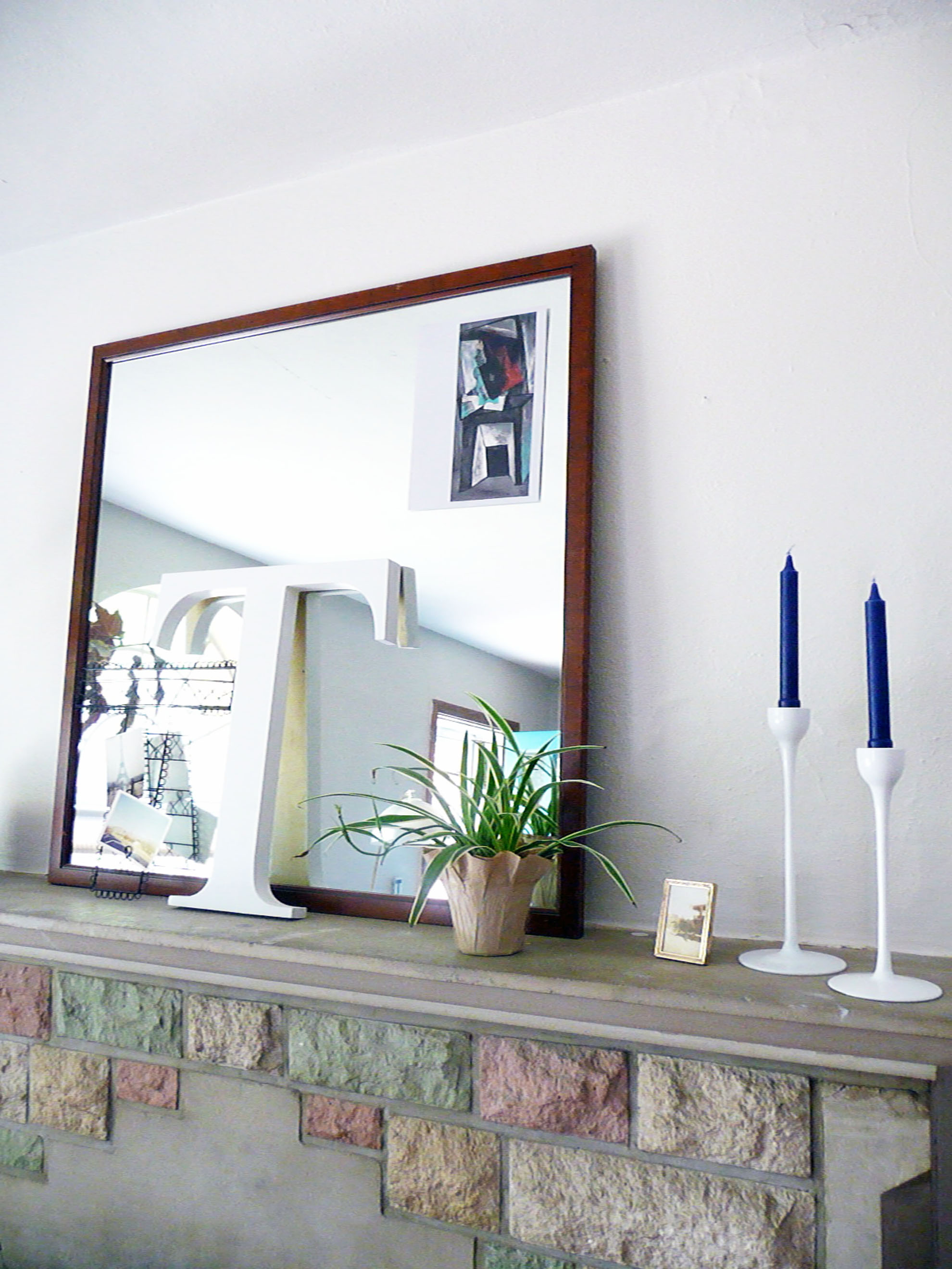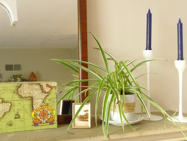 So far, all the other plants have received masculine names but I think this one may be a girl.  I think.  So I’m thinking Joan, like Joan Jett due to the plant’s spiky hair.  Joan’s been living on the mantel for a while now in the paper wrapper and plastic pot she came in.  I decided it was time for something more permanent and wanted it to look nice but didn’t want to spend any money.