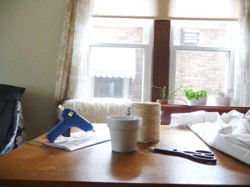 I had the following materials on hand that allowed me to make Ms. Joan a new home without spending any money: terracotta pot, white spray paint, hot glue and jute yarn/string (left over from the ZZ plant’s snuggie and Shenanigan’s doorbell).