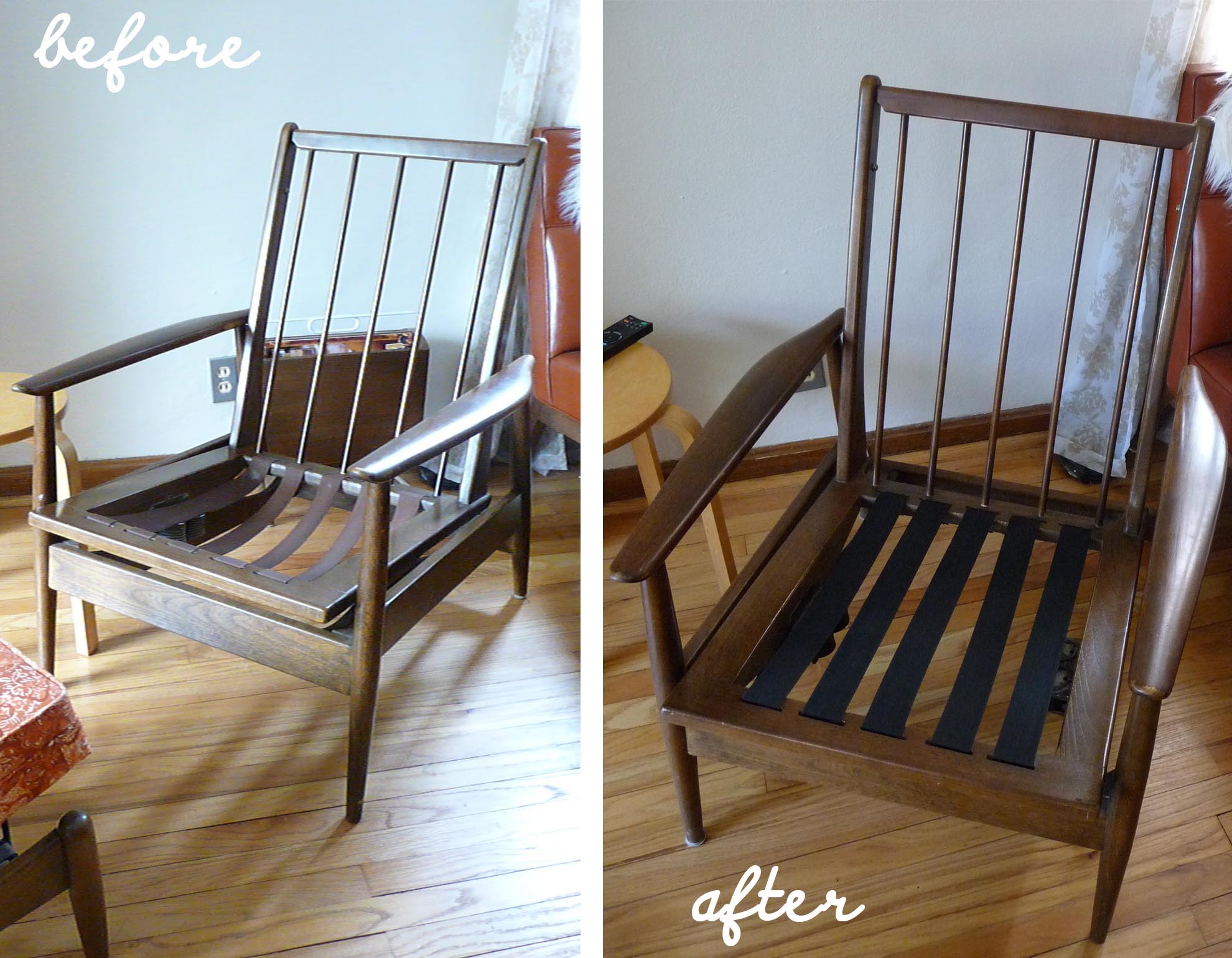 The $13 Man’s Chair in Living Analog’s living room got a little bit of a spiff up.  The straps that the seat cushion sat on were permanently warped down, down, down and they were old.  So old that they no longer had any flex and were now hard, brittle and flaky.  Time for new.  Right Shenanigan?