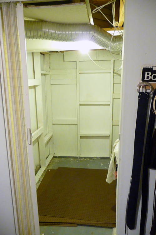 I haven’t posted any pictures of the basement on this here blog because I didn’t want to scare all you nice folks away.  In one corner of the basement (under our bedroom),  the previous owners “finished” off a room and added a walk-in closet.  I say “finished” loosely because there are no doors, no flooring beyond painted concrete and the ducting is attached with duct tape.  Although now that I type this, maybe that is the purpose for duct tape.  This larger closet was coming in pretty handy because the upstairs closets are all teeny-tiny in the style of the 1940s.  But then there was a leak or something in the mechanical stuff on the other side of the closet wall and I noticed one day my closet was smelling funny (and thus my clothes) . . . and moldy drywall was discovered and quickly torn down.
