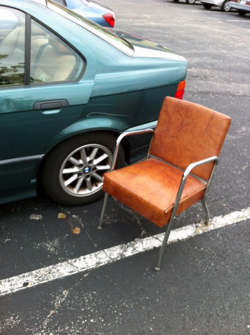 And I found a little chair I couldn’t resist. It was tucked under a large dining room table so you couldn’t really see it. I pulled it out and started marching my way through the store like a lion tamer with the chair legs out in front of me to clear the way. The check-out was so slammed with three tired looking cashiers tending to the long lines of bedraggled customers. Thanks to my little vinyl chair, I had a place to sit while I waited in line (although I looked a bit ridiculous). But here comes the kicker of the story — after dragging this chair through the store and waiting with the hordes to buy it — I couldn’t get it to fit in the car!!! Me, a person who does space planning professionally. It was a sad, sad sight. I tried it in the front seat, upside down and backwards and it would have fit — except for our little car has a dead seat motor and I couldn’t move the seat back the HAIR it would have taken. I got desperate and tried shoving it in the back seat to no avail. Finally I called the husband who came to my rescue (which was no small feat because he was on call and had to bring his whole work laptop in the car after activating and then crashing and then restarting his mobile hub.)