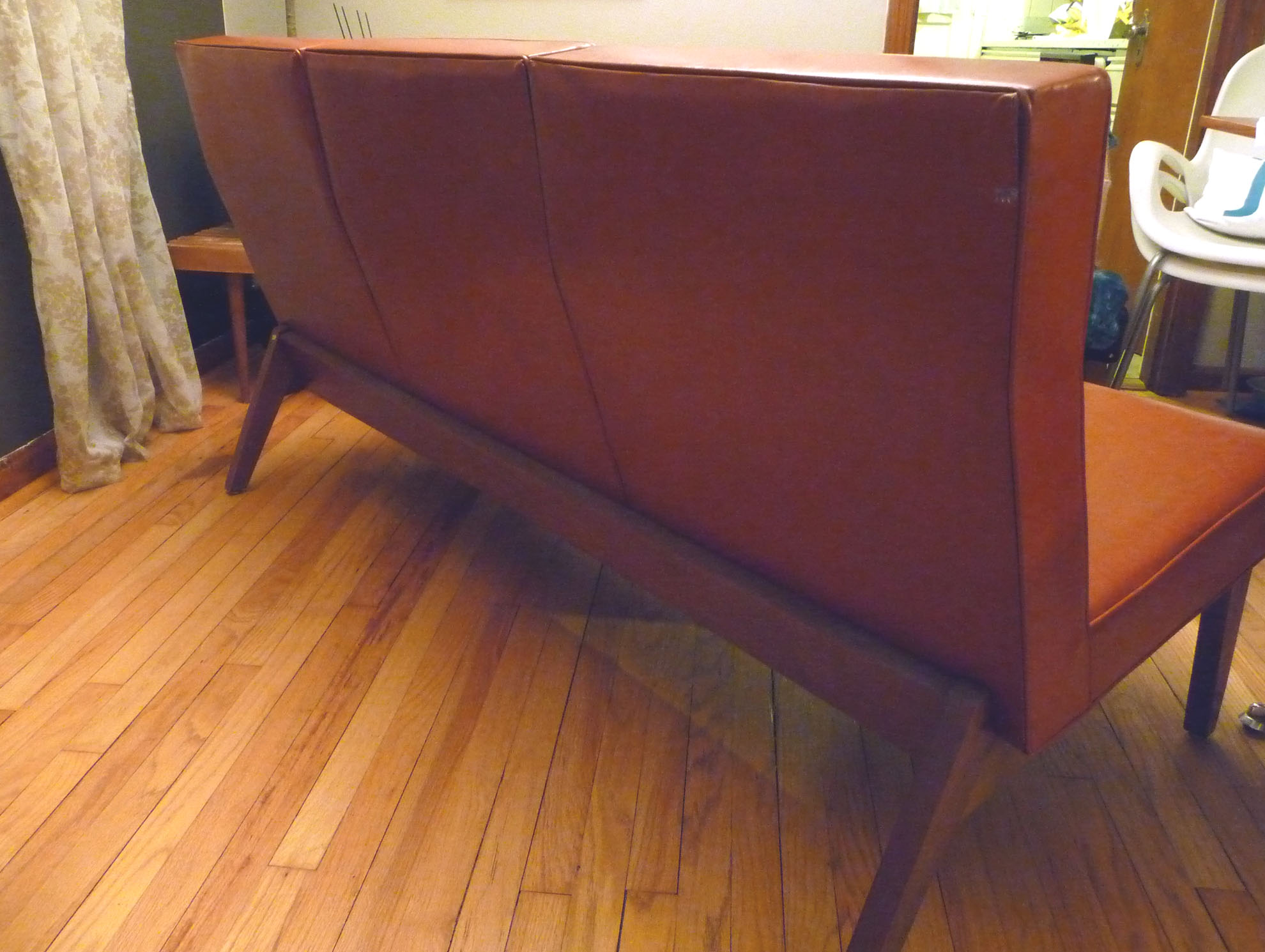 So, due to the furniture re-shuffling, things are about to get crazy around here. The first item on the chopping block is our beloved burnt-orange vinyl MCM 3-seat sofa. We’ve had it in the music room (see some bad pictures here) and it has lived in the dining room as a banquette for a while now. I love it. Husband loves it (he originally picked it out which was unusual for him to voice such a strong opinion on furniture). We just love change more.