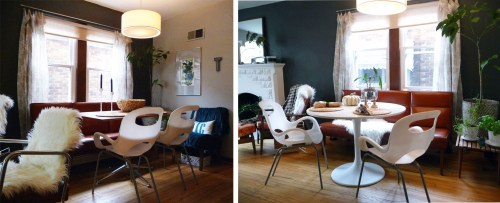 Here’s a few of the ‘before’ shots — first we had the rectangular wood table with the MCM sofa, then the Tulip with the MCM sofa and two Karim Rashid Oh Chairs. . .