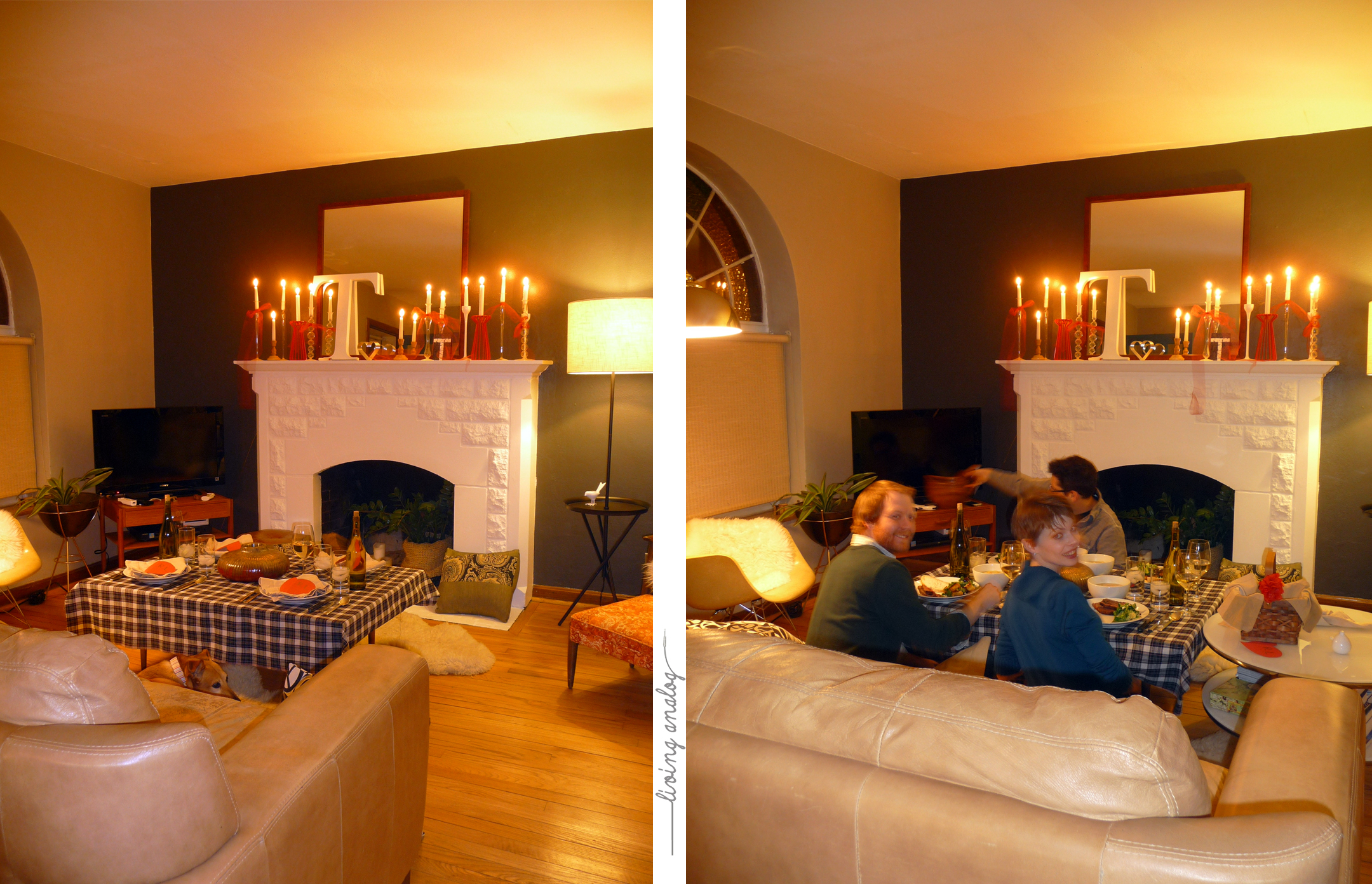 And there is everything all ablaze! We’re lucky we didn’t burn the house down. You can’t see it in the pictures, but the vessel in the middle of the picnic table is actually a firepot we got from my father-in-law a few years back. You put some gel in the middle and light it up. The flames were at least three inches tall during the whole meal. It added some extra excitement to what could have been simple things like passing the bread. All in all I think it went well! We only forgot one thing and nothing burned and/or was inedible (that we know of. . . ). It was really great to spend an evening with friends and enjoy some food and 1964 style hospitality. Next up is a “Mad Men” birthday party for my sister in March, so then I can break out my 1964 style dress (and candy cigarettes I bought for the occasion!). Cheers – CT