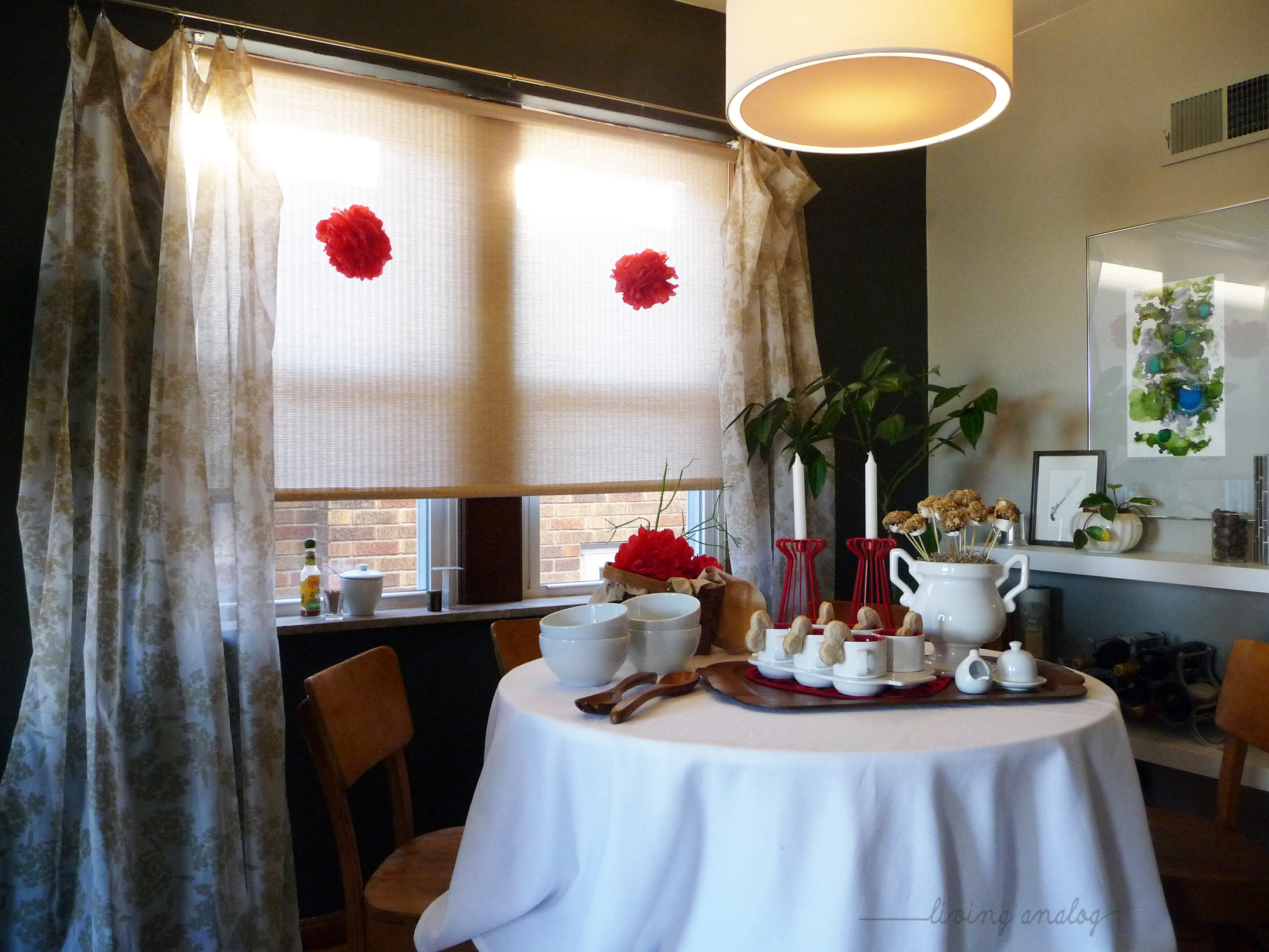 That one-staple heart construction paper heart garland might look all right in the picture but it wasn’t really cutting it. They weren’t really going to hold their heart shape once strung up. I used some fishing wire to hang up a few tissue paper pom-poms in the dining room for that extra pop of red. A few of the small ones I put on a grapevine wreath on the front door.