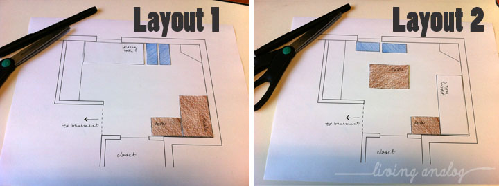 Floor plans and furniture plans are the best part about having access to CAD. If you didn’t, some graph paper could be your best friend — set each box on the graph as an increment (1″ or 6″ or whatever fits) and use that as a guideline for anything you draw. The furniture got cut out so I could rearrange to my heart’s content without lifting any heavy items.