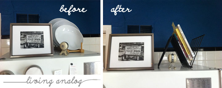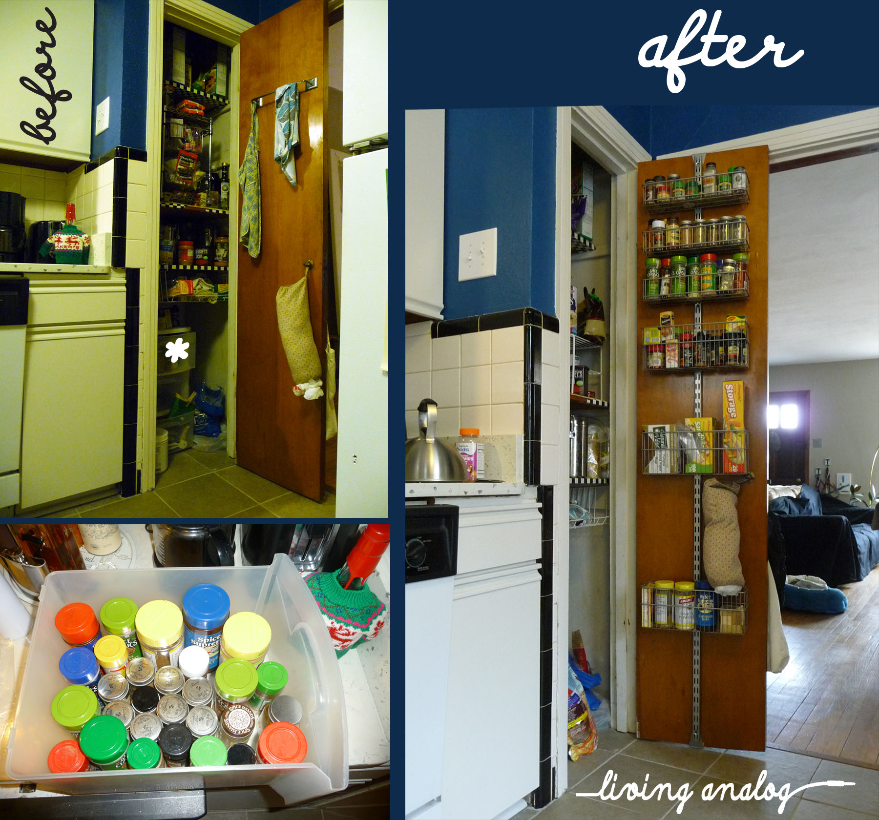 The Elfa Over-the-Door system (also from the Container Store, are we sensing a trend?)  has made cooking SO. MUCH. BETTER.  Before all our spices were haphazardly placed in a pull out bin (see asterisk on the before picture).  In order to get at said spices, you had to pull out the whole bin, search for some precious space on the counter and hunt until you found the right spice (they’re not all labeled on the top).  Thanks to a gift card from my brother and sister-in-law for Christmas we took advantage of the January Elfa sale and splurged on this puppy a little.  But not to despair – it clamps to the top and bottom of the door and tightens down with a screw so we can take it with us forever and ever wherever we go (and we will).  The baskets easily lift off the track for quick spice access.  I could go on and on but let’s just say this thing is the bee’s knees and I love it and want to add a few more baskets.  (Also I just noticed the random black cloth on the sofa in the after picture – I was photographing a guitar for JT’s eBay endeavor and I could see the tan sofa reflecting on the nice shiny black guitar so presto – magical invisibility cloak cloth.)