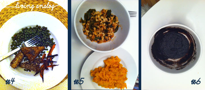 4. Cornmeal-Crusted Tempeh with Carrots and Green Lentils from The Candle Cafe Cookbook by Joy Pierson and Bart Potenza (just the tempeh recipe, the roasted carrots are from Door Sixteen – here.  The lentils we had in the freezer . . . )
