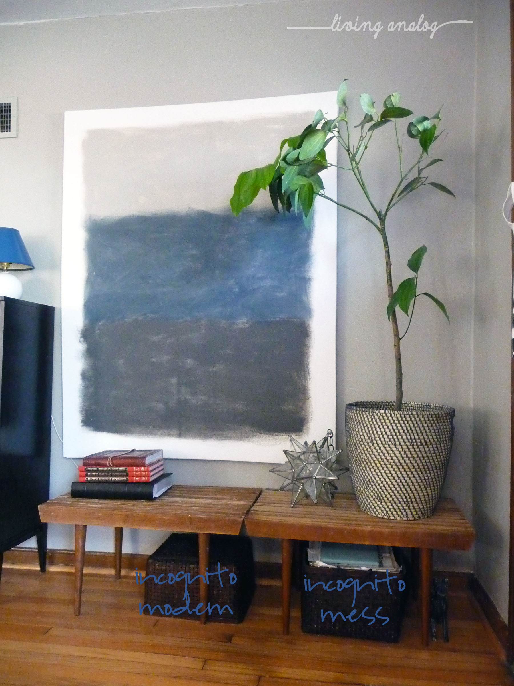 The great thing about this arrangement is how great this works as a “landing strip” (Apartment Therapy’s words, not mine) or stuff containment zone. When we come in the front door (right there to the right), we can put down our work bags, slide our shoes under the tables, drop our keys on Paul. It’s all working out great. The modem is also under the tables as well — they had to drill through the wood floor (so horrible, but before the days of wireless stuff and we used to have our TV there back forever ago when we had cable). It’s hiding in the turned over basket. The basket is pretty open weave and a lot bigger than the stuff under there so it seems to be “breathing” all right.