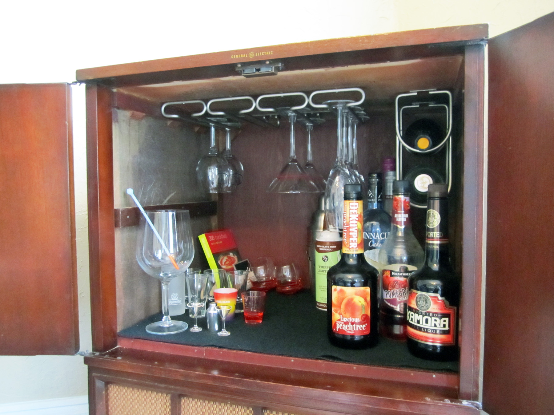 I have speakers in the lower section and put on a small command hook to hold the auxiliary cord that goes into the headphone jack of my ipod/computer/phone.  Also, all the hardware was purchased through Home Depot (mostly online) or I had it on hand.  The wine bottle holder was about $11 and the stemware rack was $25.  So, with those and all the little extras (minus the cost of a power screwdriver/drill), the makeover cost about $45.  Not bad for a custom bar!