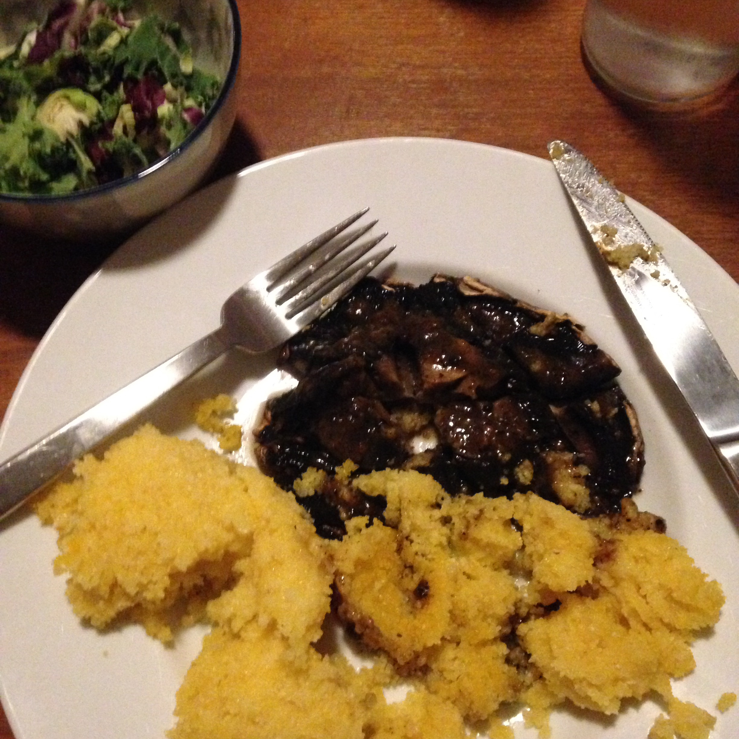 I was Pinterest searching the other night for some veg burgers to make for a work camp outing (always interesting to camp with your co-workers …), I traveled down the rabbit hole and found the recipe in the link above. I didn’t even end up putting it on a burger, but I’ve been putting it on Everything Else I Can Get My Hands On. Case in point, the portabella cap and polenta in the image below. Mouthwatering. It would be great on any vegetable – broccoli, cauliflower, squash (zoodles …. mmmm!) and paired with a black pepper sauced rice, you’re talking a Foodie Award. (Is that a thing? It is now.)