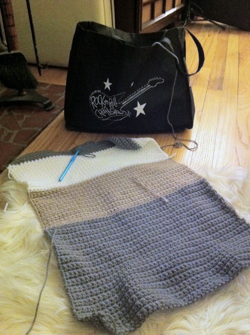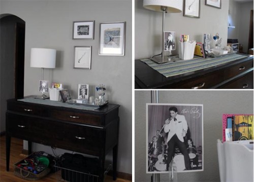 We managed to fit in all of JT’s amps, guitars and miscellaneous equipment. Thanks to my luck at IKEA, we had an extra faux sheepskin to create a bench on our Gap sweater drawer (right now holding, you guessed it, miscellaneous musical equipment.)