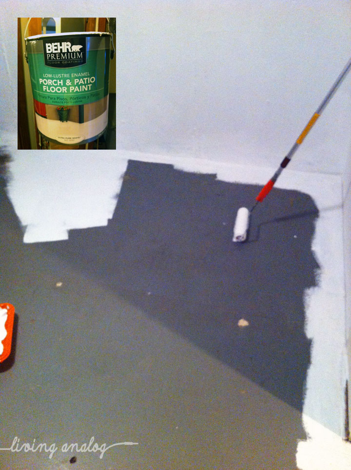 JT and his dad made a trip to rural Ohio this past weekend for some time with his sweet 94-year-old grandmother. With some free time on my hands, I decided it would be a good time to tackle my little basement lair, the “studio”. (See this post for the crazy before pictures.) It’s a tiny room with two concrete walls and concrete floors. I’m going to add an area rug over the concrete to warm it up but I wanted to paint all the concrete first. . . seal it up and clean it up. I am using the same Porch & Patio floor paint we used on the living room fireplace and am so excited to have a white floor somewhere in this house!