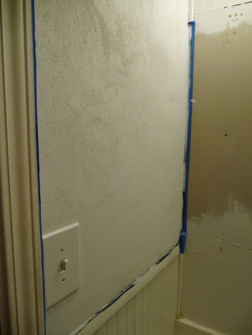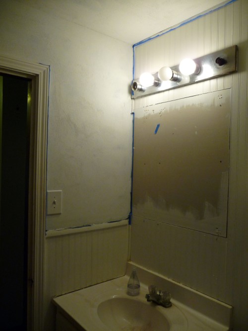 The one downside of giving myself a one month deadline on an unplanned project was I didn’t have the funds set aside to do everything right away (hence the delay on the mirror.) We did a lot of “unseen” work — changing out all the wood trim, recaulking the bathtub, texturing the walls, changing out both light switches and the GFCI outlet for new white ones — the money kind of burned out fast. JT and I have been trying to clear up some credit card debt and so I wasn’t willing to charge anything to get this one done. The mirror should be in place soon though!