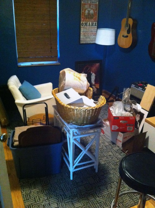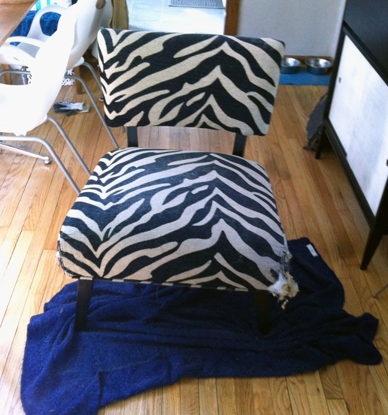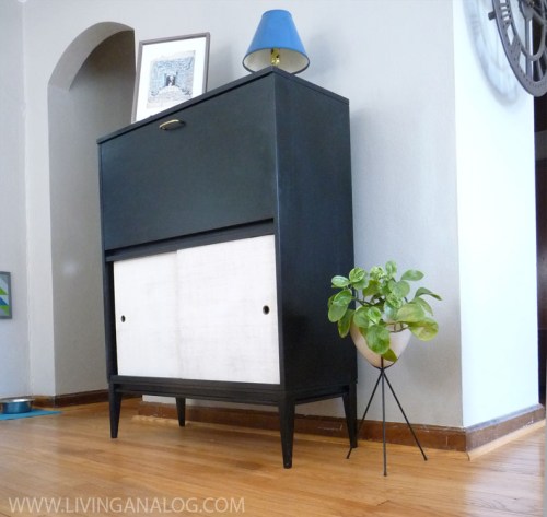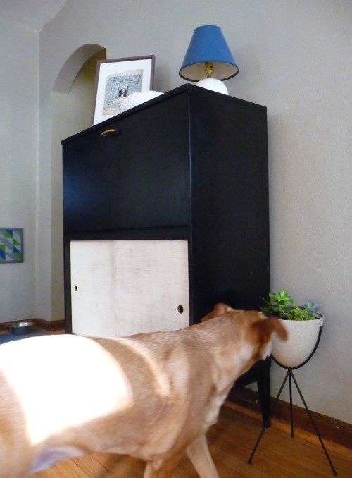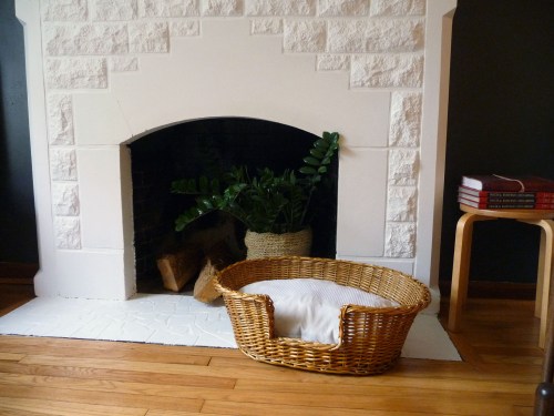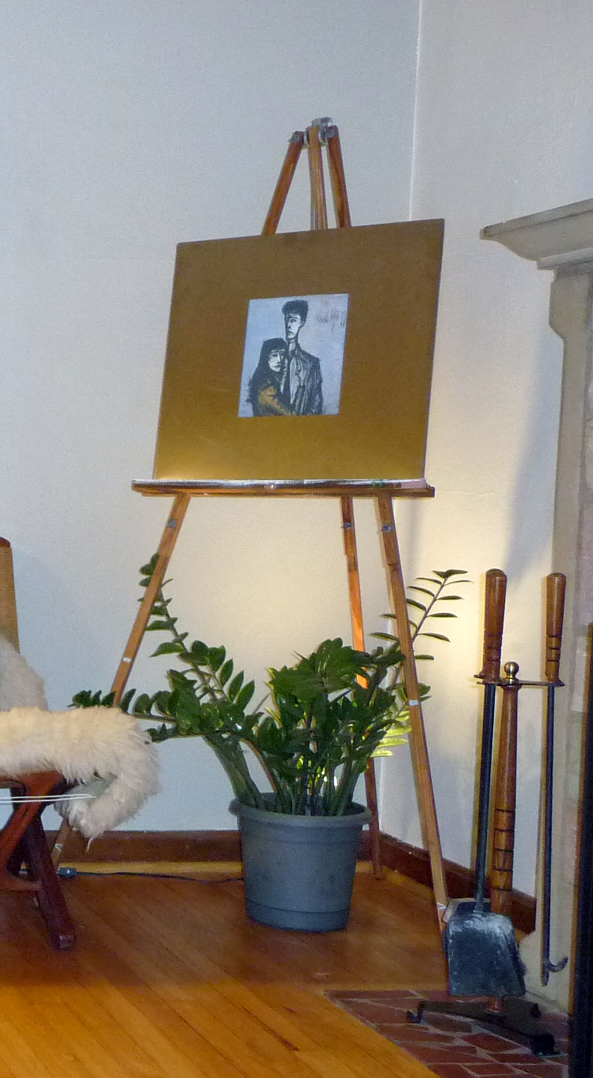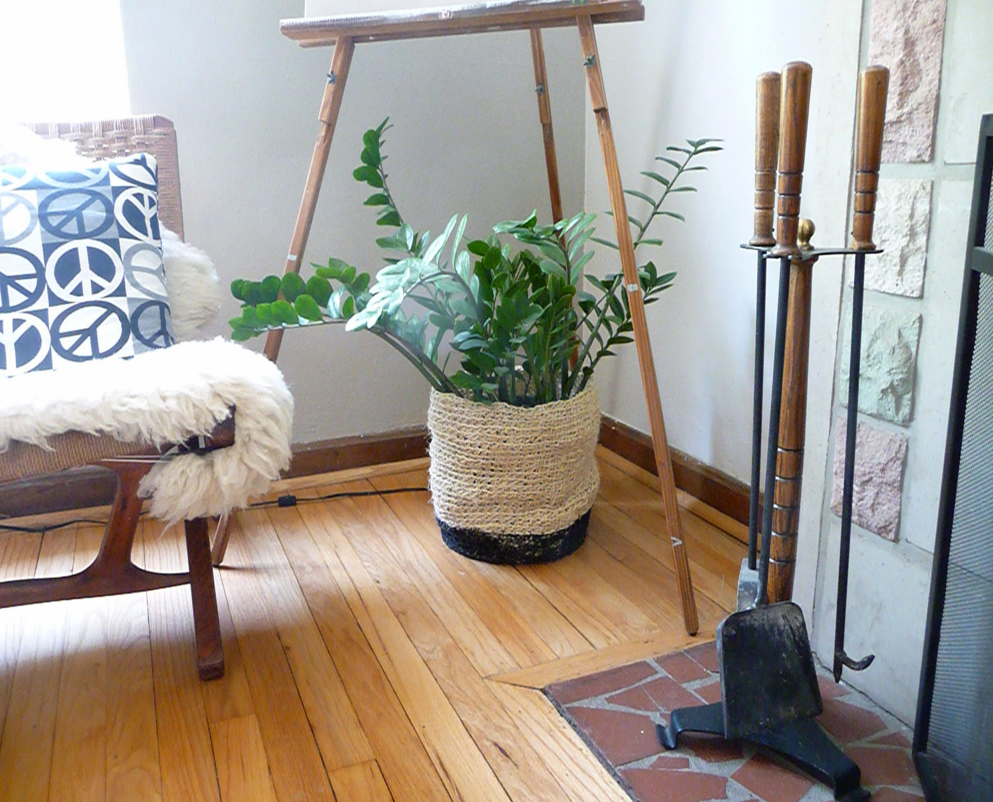 Before George/Zappa was just hanging out in a standard issue green pot and once we brought Hans and Wenger, the new chairs, home, he now has a floor light (can uplight from cb2) behind him to light the easel from below since we took off the clip light that used to be above.