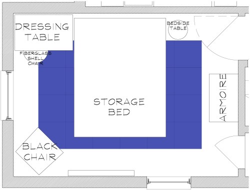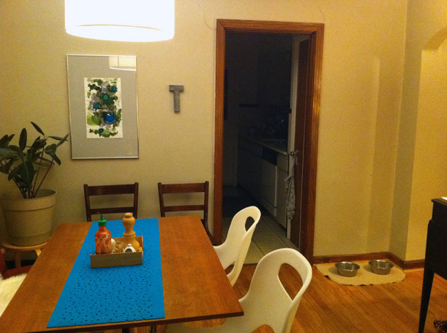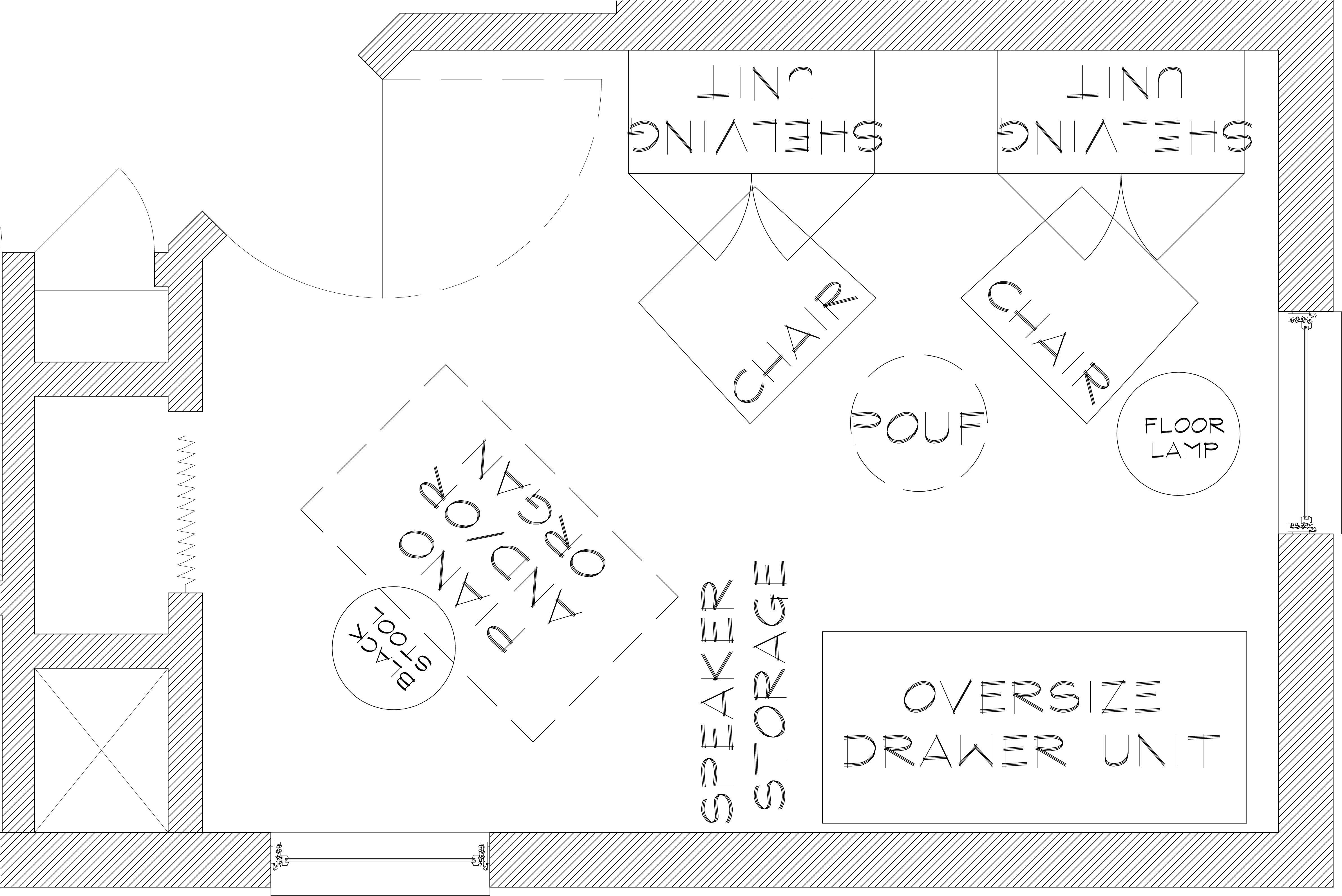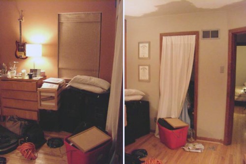 We managed to fit in all of JT’s amps, guitars and miscellaneous equipment. Thanks to my luck at IKEA, we had an extra faux sheepskin to create a bench on our Gap sweater drawer (right now holding, you guessed it, miscellaneous musical equipment.)