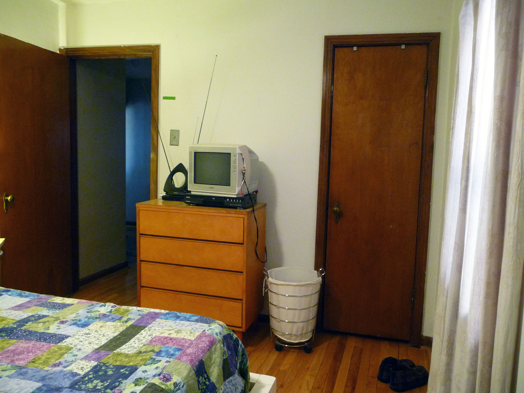 I have a love/hate relationship with the mirrored closet doors. They’re so functional yet so …. tacky. They do help bounce the light around the room. You can kind of see in the reflection that we have the Koehler white vinyl rocker/lounger in the corner for a little sitting/clothes piling area. JT got that chair from Goodwill during college and I think we may have it forever. I love it – there’s nothing tacky about it! You can kind of see beyond that the master bedroom opens into the sink area of the master bath and then around the corner and behind closed doors is the water closet and a large tub/shower.