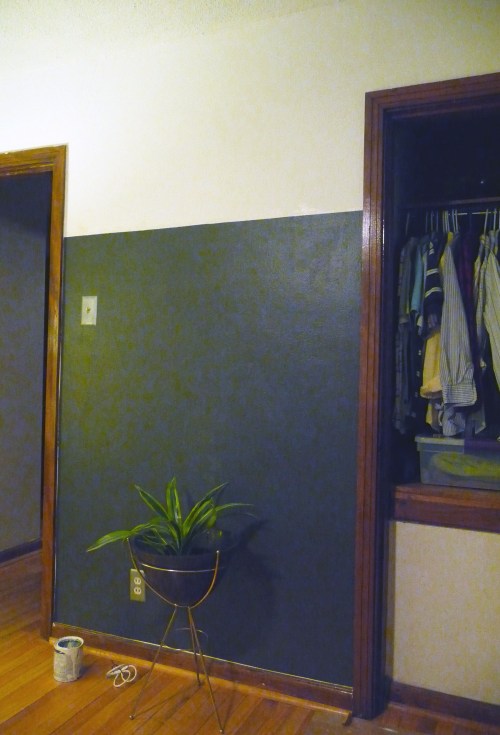 Before we moved in, we painted the bulk of the first floor Benjamin Moore “White Dove”. We stopped the paint at the corner at the bottom of the stairs before it turns and goes up into the two volume space. So for a while, downstairs was gorgeous gleaming white and the upstairs was still that dingy, fleshy beige that drives me crazy.