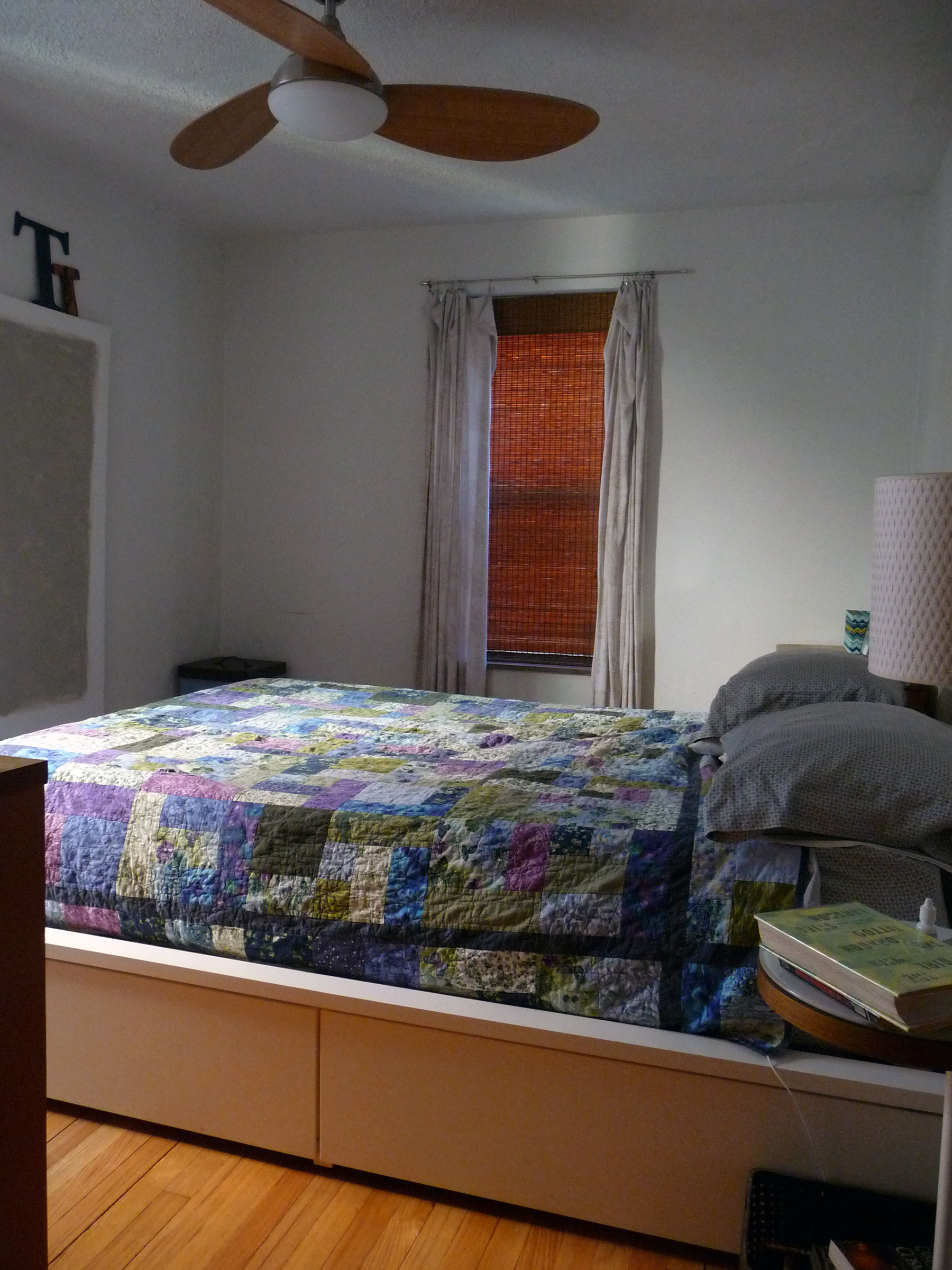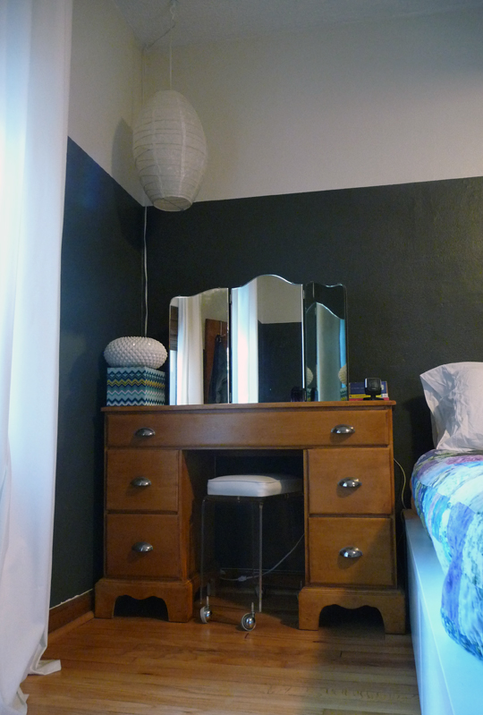 So that’s the master bedroom in the new house, a little sanctuary in the sky. There’s still work to be done in there (we need a non-ugly fan STAT!) and I didn’t show more photos in the bathroom part of the suite on purpose – it’s a work in progress but we’re loving it.